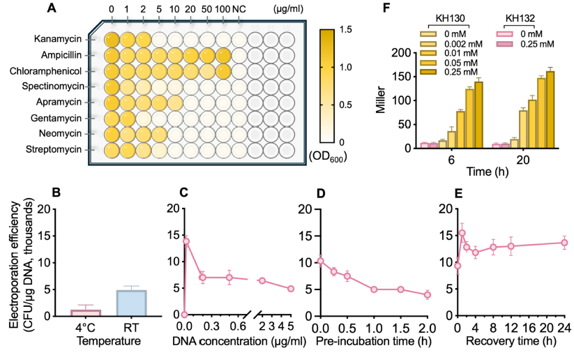 图1. 食油假单胞菌 T9AD 抗生素敏感性谱的测定(A),其电转化效率的优化以(B-E)及其中基于质粒的基因表达评估(F)