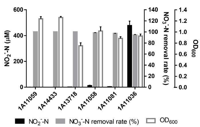图1. NO3−-N去除率, NO2−-N累积量以及菌体OD600
