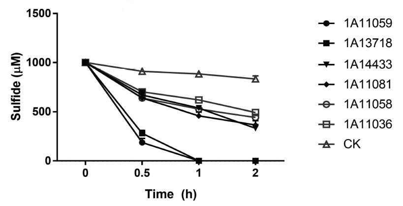 图2. 菌株硫化物氧化(初始Na2S浓度为1 mM)