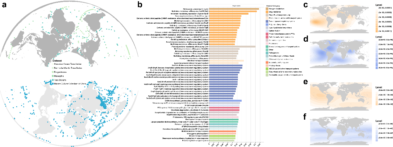c. 全球海洋微生物在真光层(EPI)的多样性分布(门水平),赤道附近南太平洋多样性最高