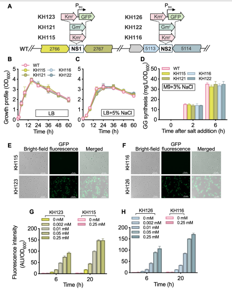 食油假单胞菌基因组中性平台的开发:基因组中性位点(NSs)是细菌遗传和代谢工程研究的有用工具。在这些染色体位点插入基因不会引起细胞可检测的表型变化。分析了 T9AD 菌株的基因组,选定了NS1(POT9AD_2766-2,767)和 NS2(POT9AD_5113-5,114)来研究其中性。通过同源重组将 Kmr基因和 Gmr基因分别独立引入这些位点(图2, A)。所得突变体 KH115、KH116、KH121 和 KH122 表现出预期的抗生素抗性。无论培养基是否含有 5% NaCl,突变菌株的生长均与野生型菌株相当(图2, B, C)。这表明外源基因整合到 NS1 和 NS2 并不影响食油假单胞菌 T9AD 的基本生长及其耐盐性。进一步研究发现在 NS1 和 NS2 的基因插入不影响食油假单胞菌的葡萄糖基甘油(glucosylglycerol, GG)合成代谢(图2, D)。